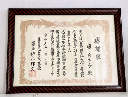 2023.2.22猫の日に寄付した動物基金様より感謝状をいただきました。
